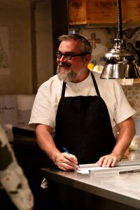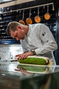 Han arbejder med de bedste og mest eksklusive råvarer og mestrer som få, arbejdet med de rige, klassiske saucer og kunstfærdige konstruktioner indbagt i butterdej, tillige med patéer og terriner, udsmykket med det sirligste filigran arbejde i dej.